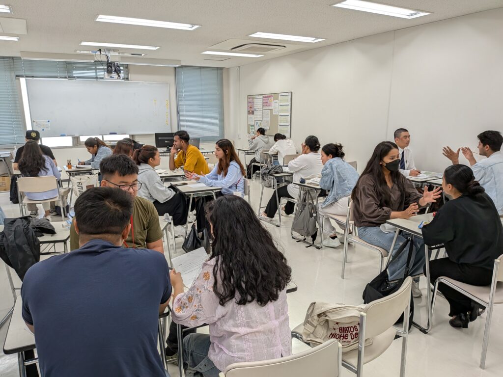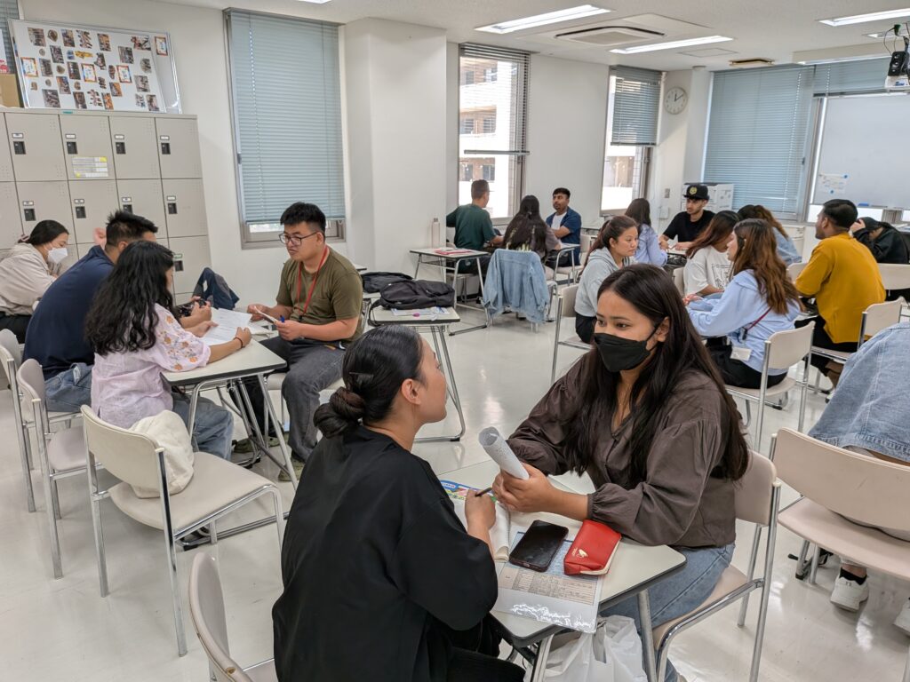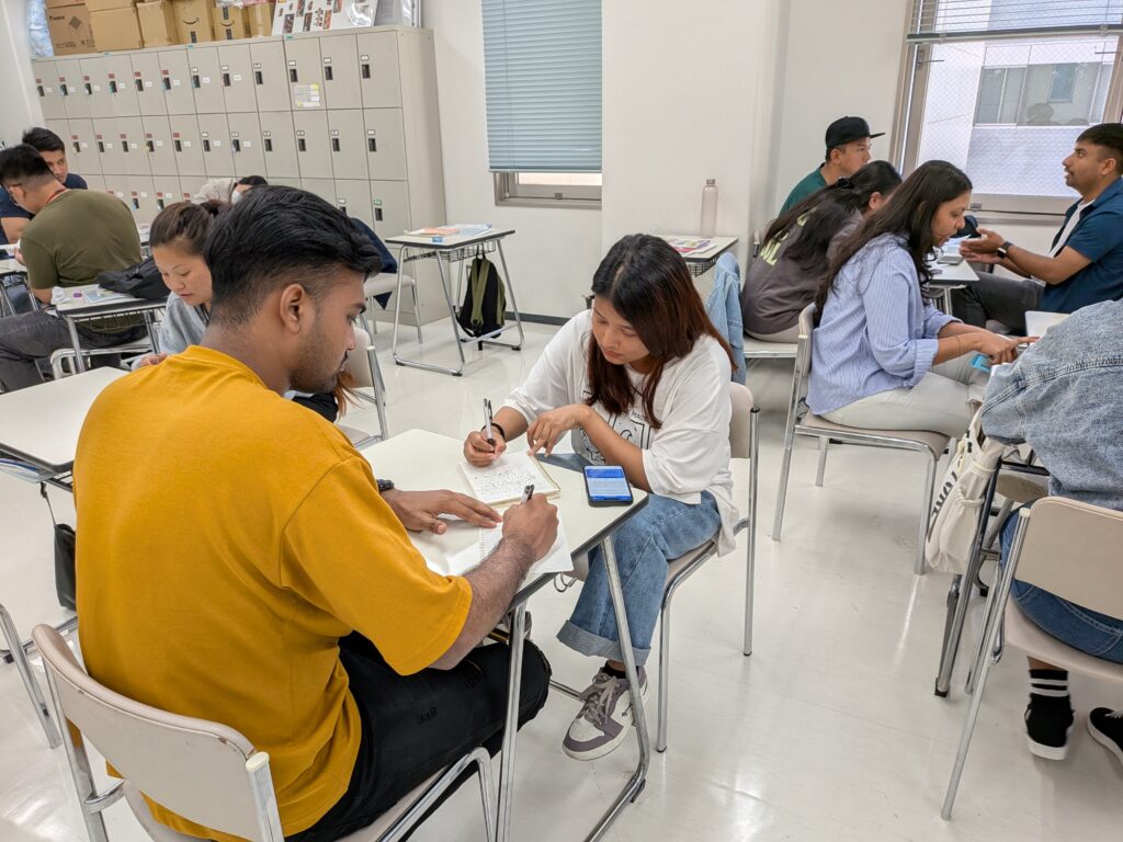 日本語と母国語が入り混じる中でも、学生同士が意見を出し合いながら真剣に取り組んでいます。