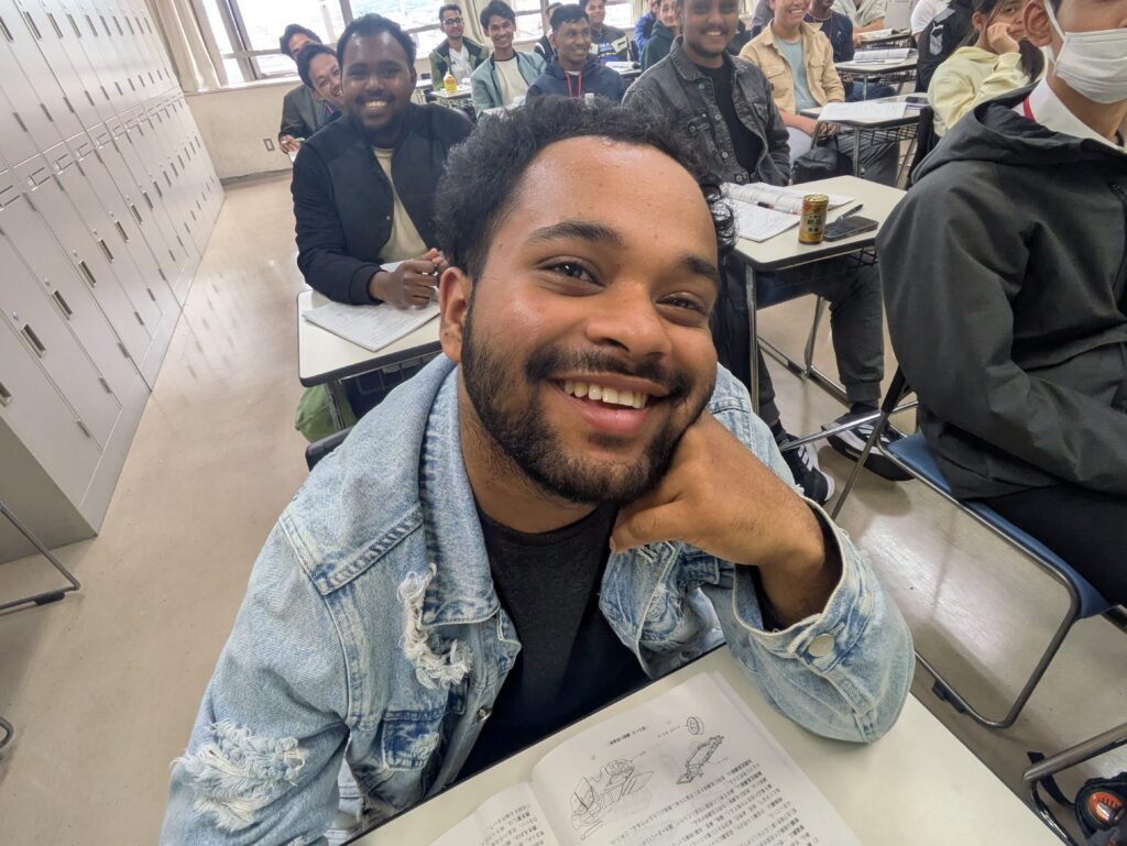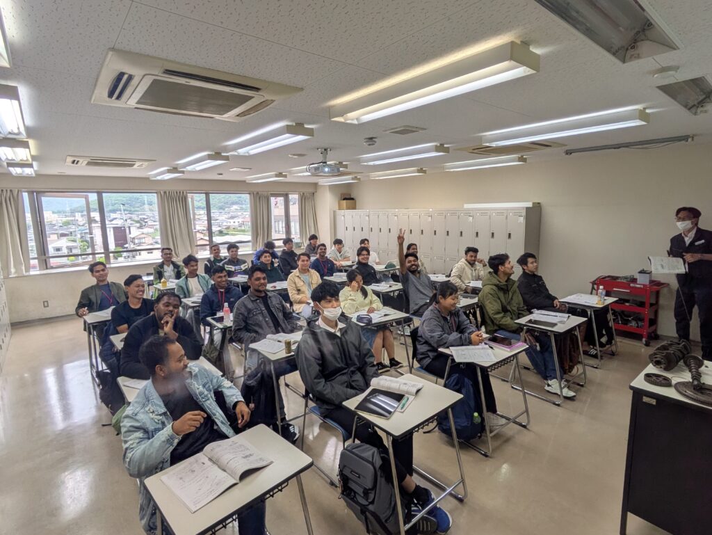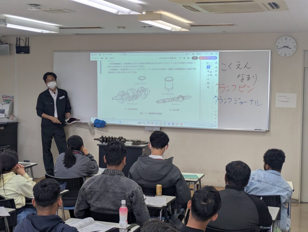 新入生のエンジン構造の授業です。真面目に先生の話を聞いています。